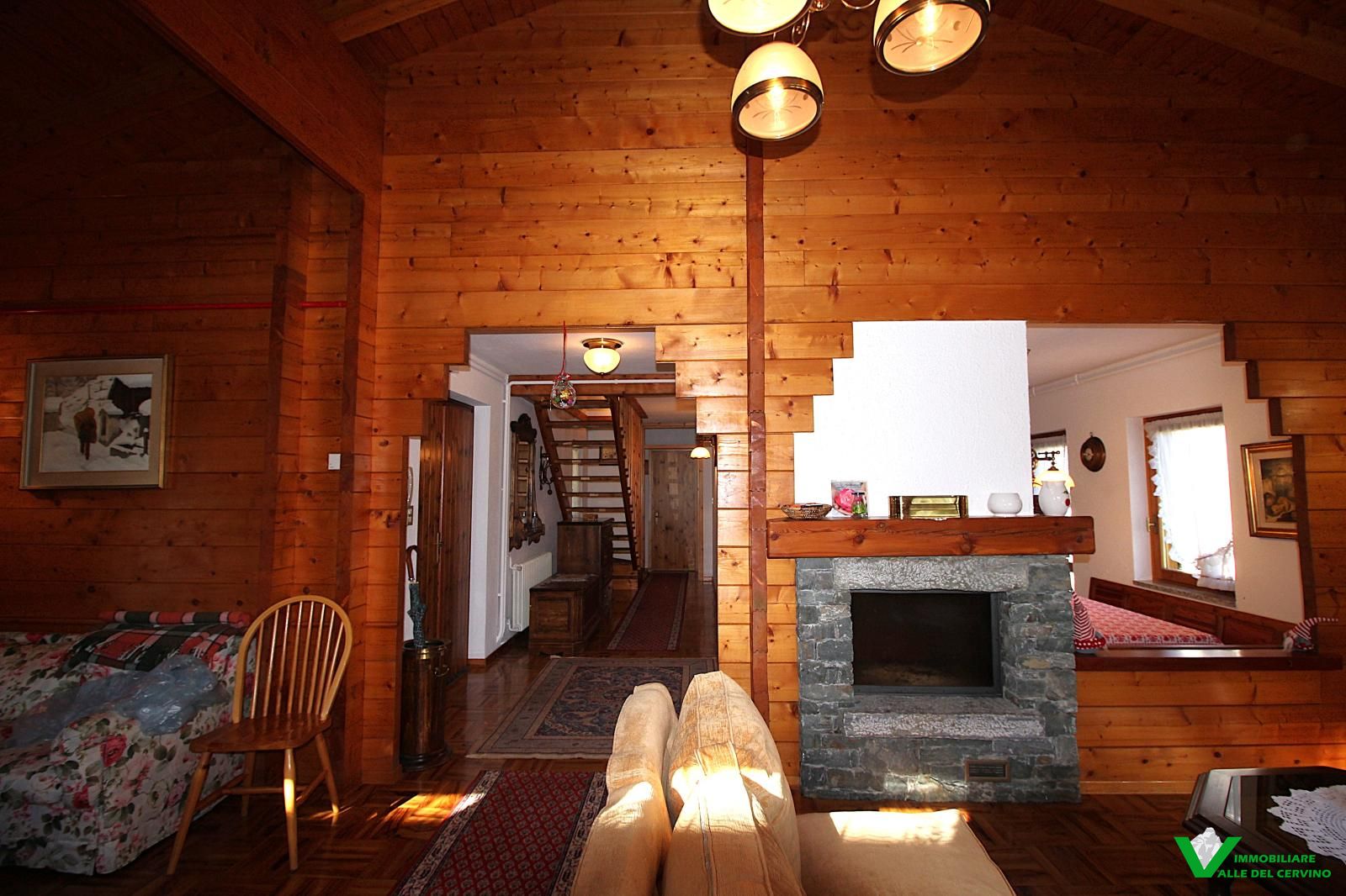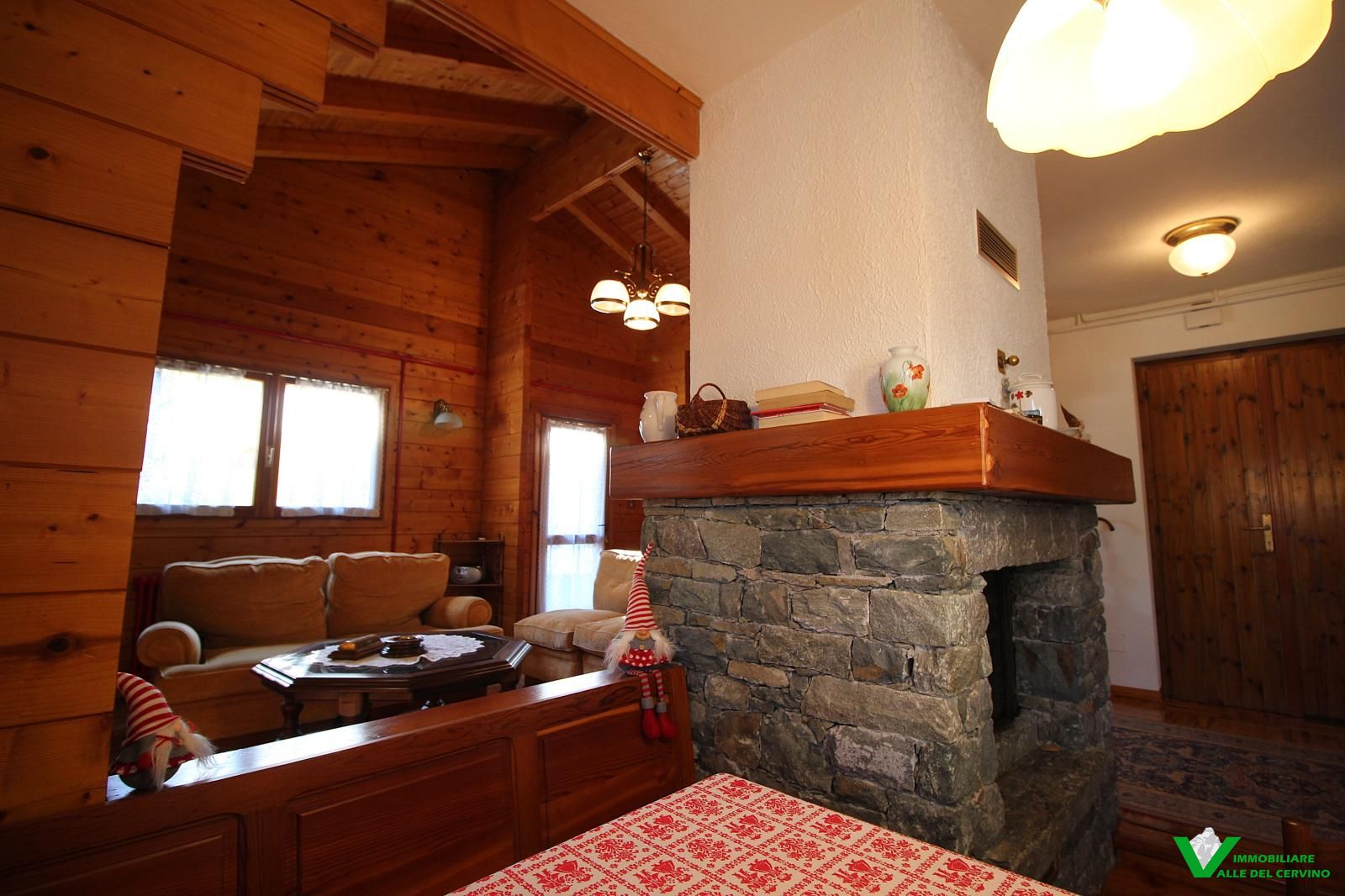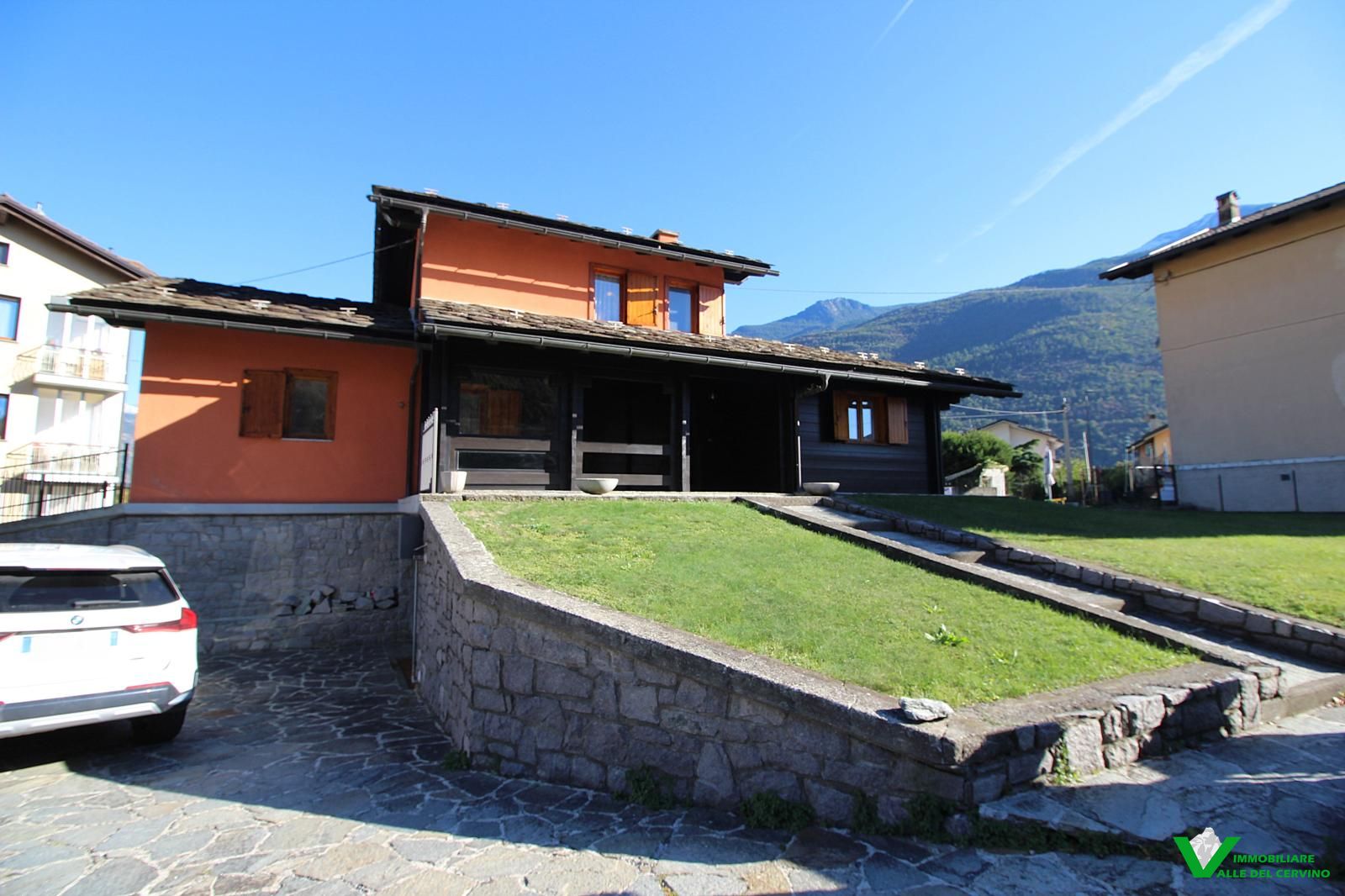In località Grange de Barme, tranquilla e a poca distanza dai principali servizi, suggestiva villa indipendente circondata da 500 mq di curata area verde nella quale risalta tradizinnale scultura in legno. Entrando da gradevole porticato si può apprezzare la riuscita distribuzione degli spazi con separazione degli ambienti angolo cottura, zona pranzo, soggiorno e salotto in unico open space nel quale risalta caminetto bifacciale; camera e bagno finestrato a completare il piano terra: da tutti gli ambienti accesso diretto all'area esterna. Al piano primo e ultimo 2 camere entrambe con accesso a balcone con gradevole vista sulla valle e bagno. Esternamente posto auto e box auto, cantina e locale caldaia.
