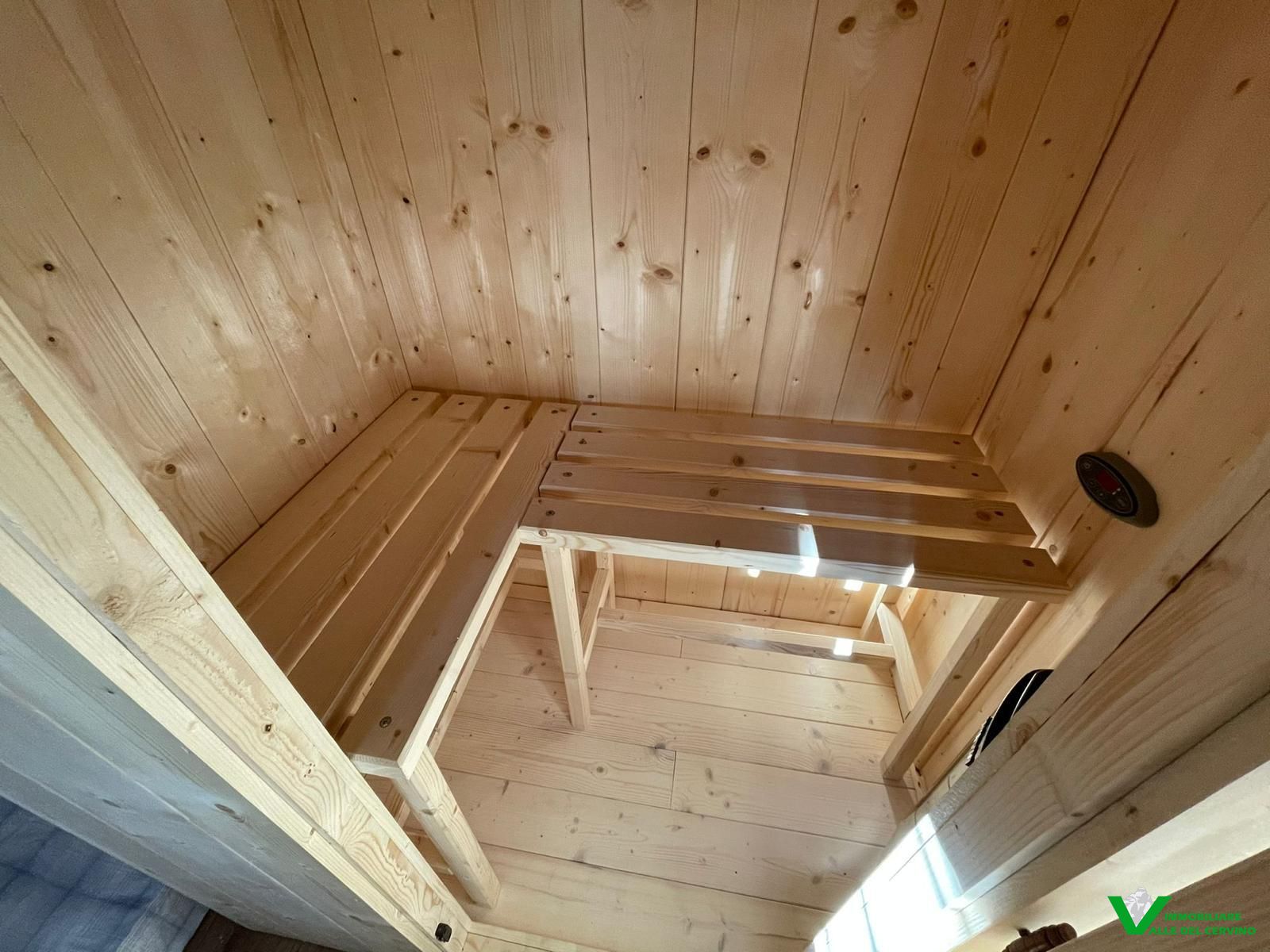 Sauna, deposito e legnaia al piano seminterrato con area verde di pertinenza.
