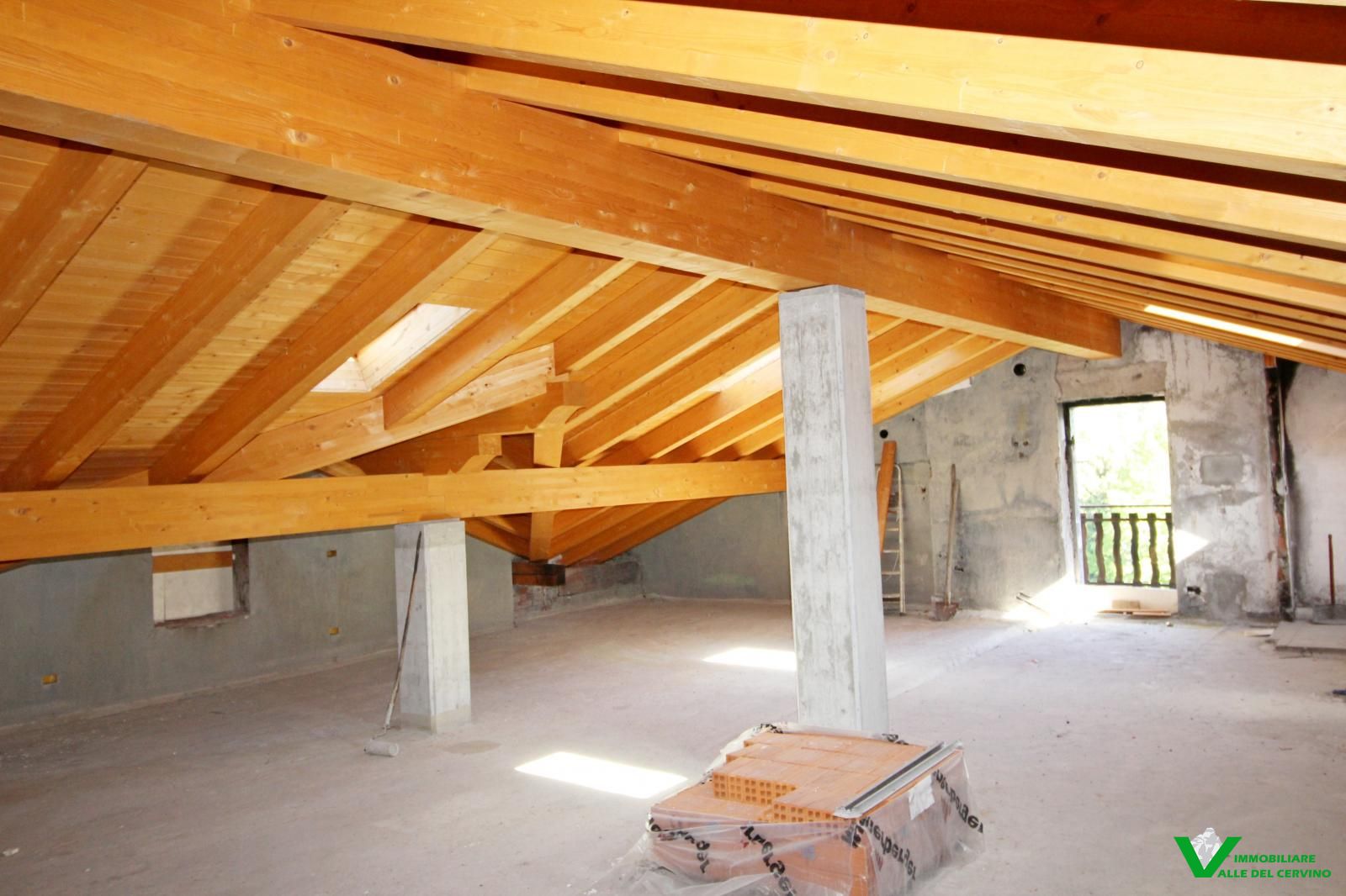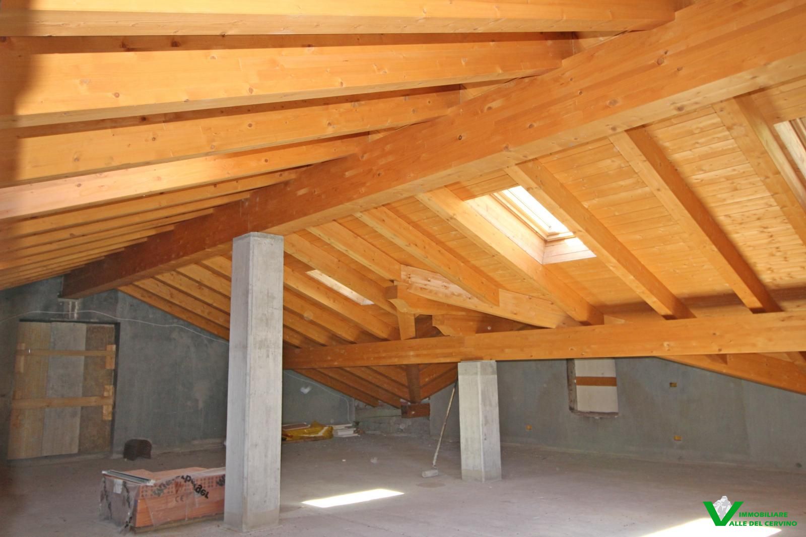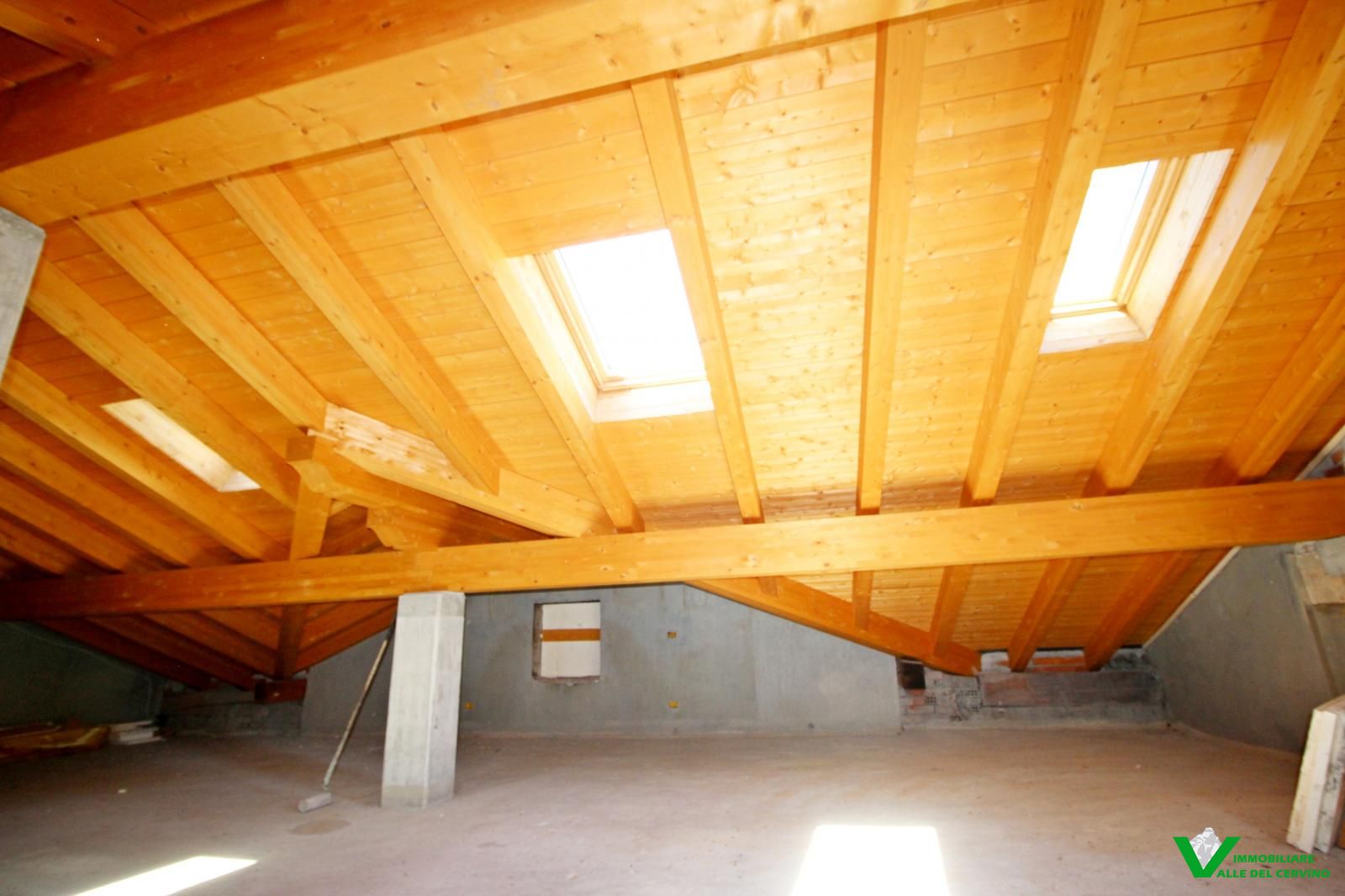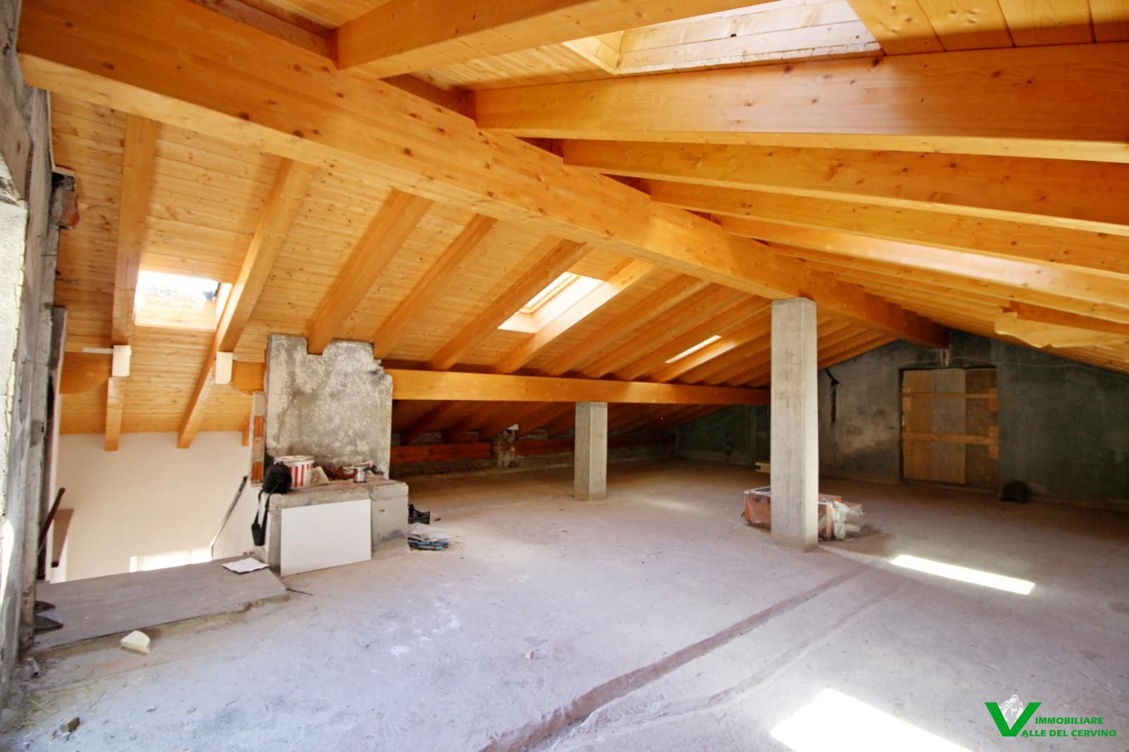 In posizione centrale e comoda a tutti i servizi, attico con balcone da cui godere di bella vista sul Cervino, venduto allo stato grezzo con rifacimento totale del tetto da completare per la realizzazione di trilocale con doppio bagno più ulteriore vano da adibire a terza camera e/o ripostiglo. Al piano terra ampia autorimessa doppia con annessi 3 ripostigli venduta a parte ad un costo di € 35.000