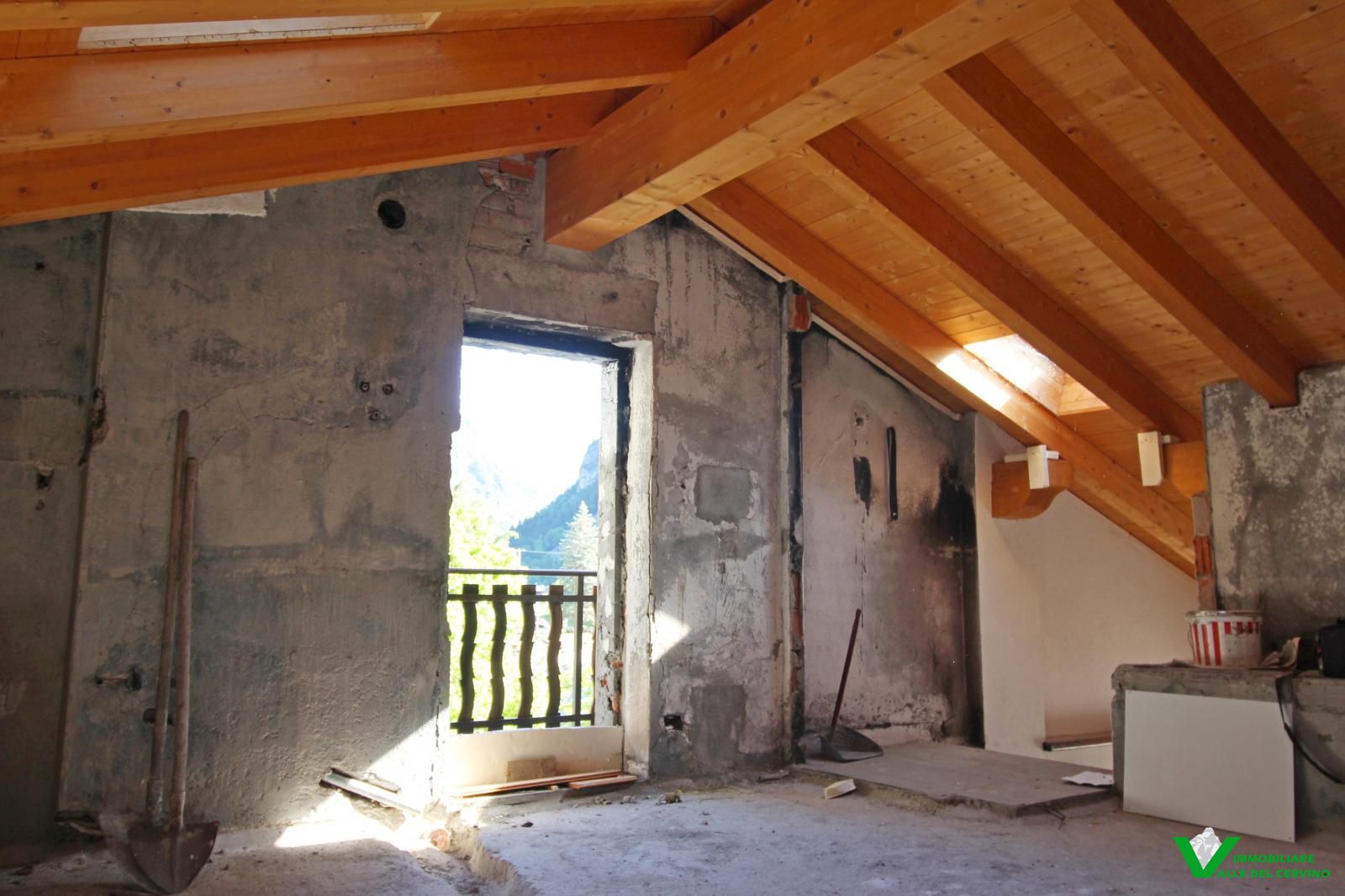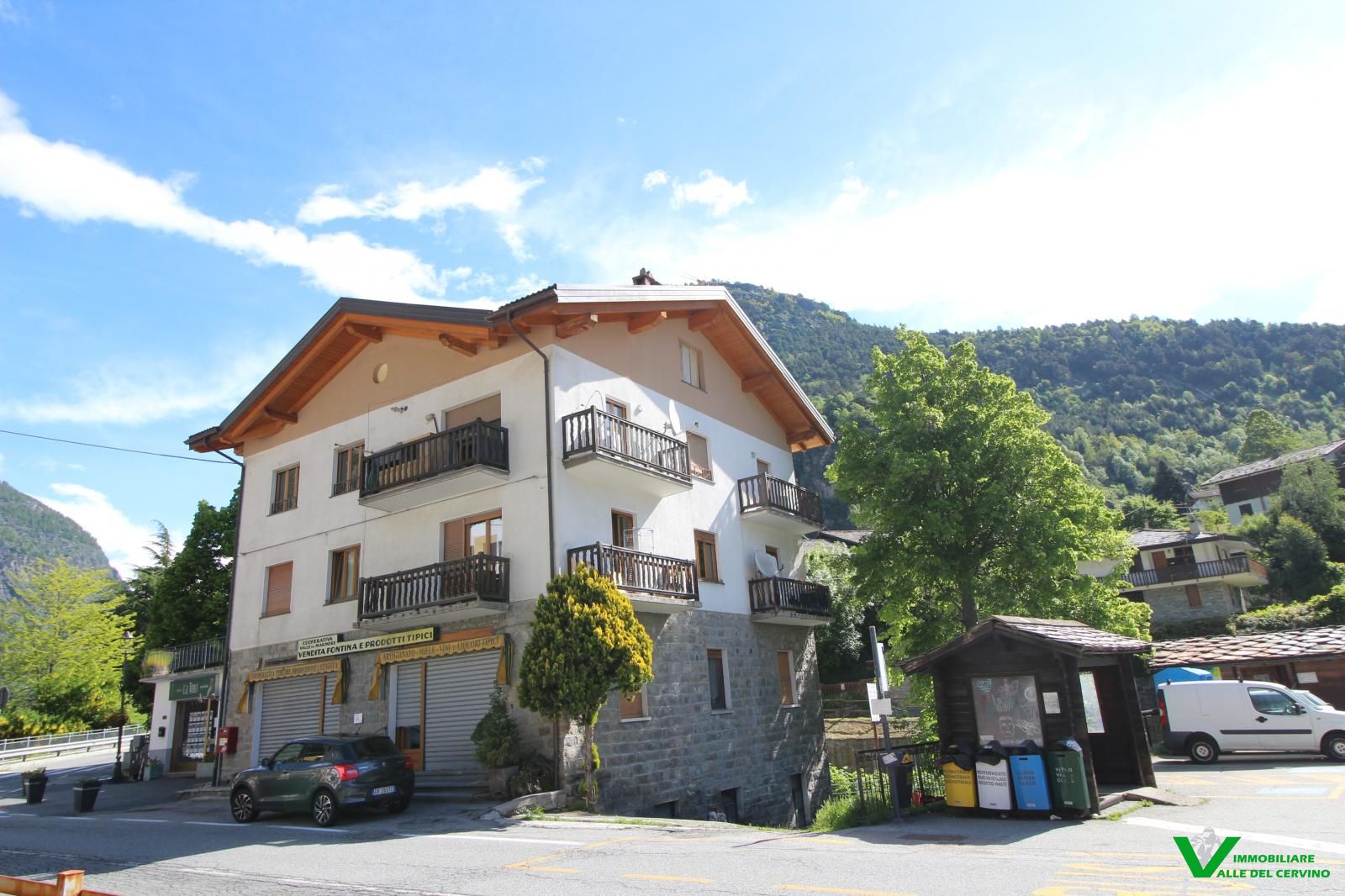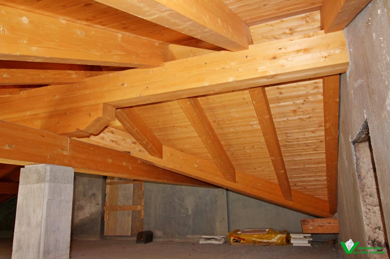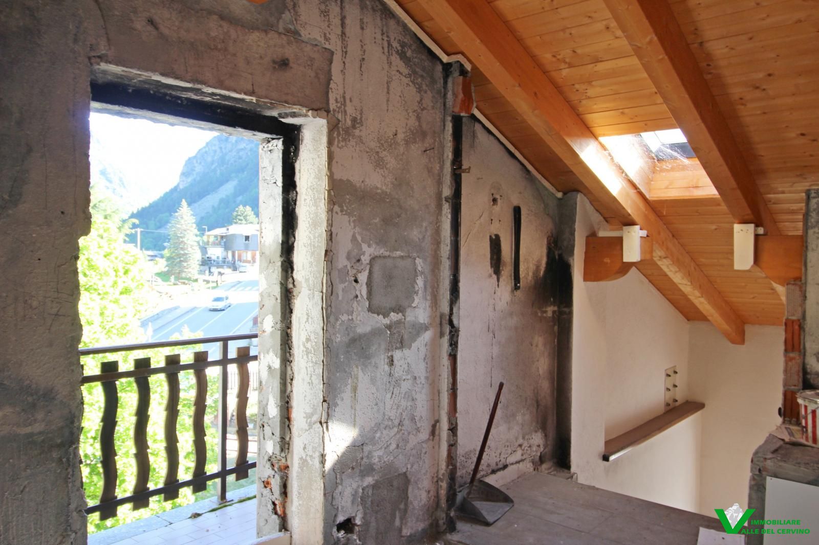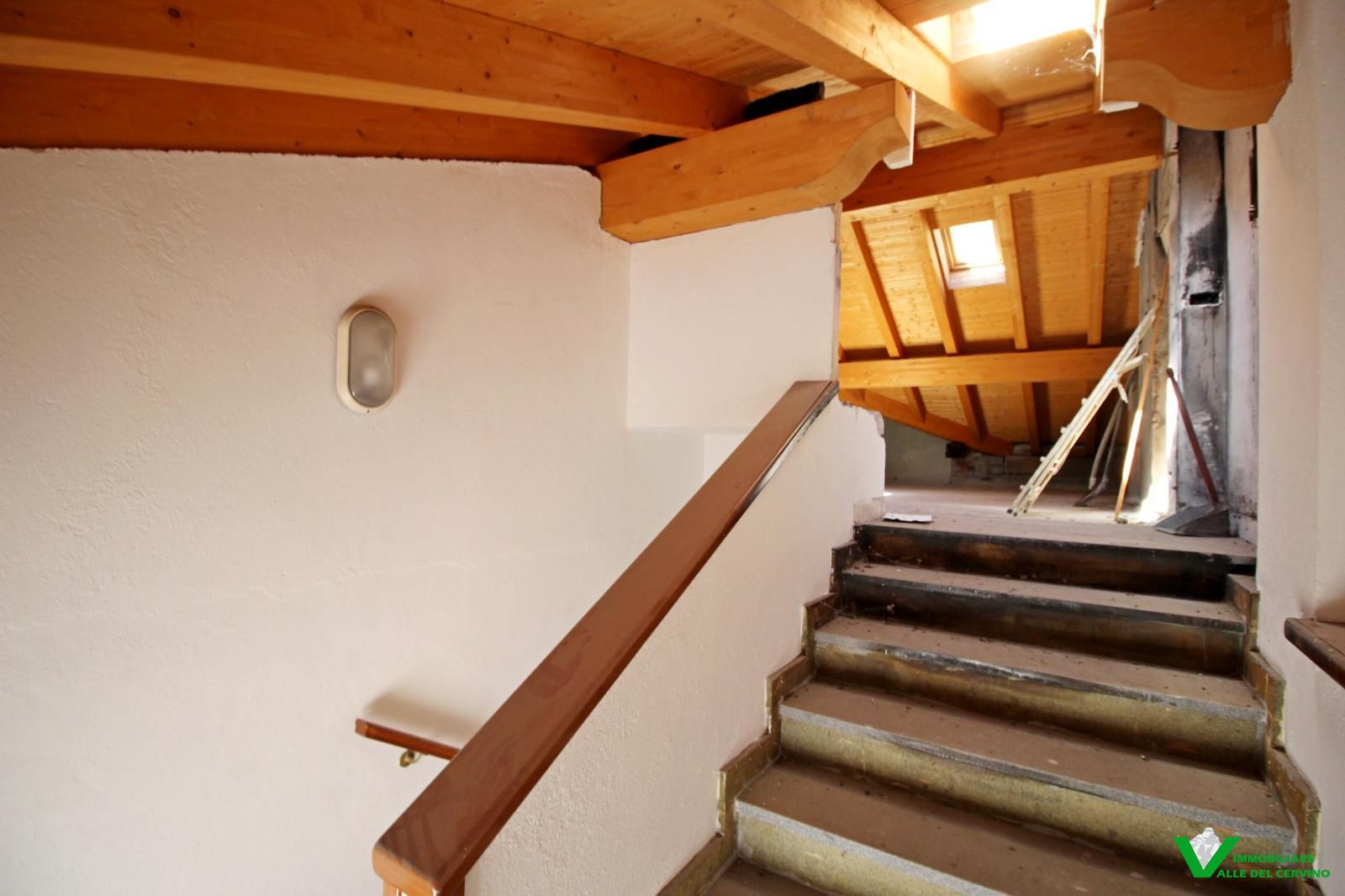In posizione centrale e comoda a tutti i servizi, attico con balcone da cui godere di bella vista sul Cervino, venduto allo stato grezzo con rifacimento totale del tetto da completare per la realizzazione di trilocale con doppio bagno più ulteriore vano da adibire a terza camera e/o ripostiglo. Al piano terra ampia autorimessa doppia con annessi 3 ripostigli venduta a parte ad un costo di € 35.000