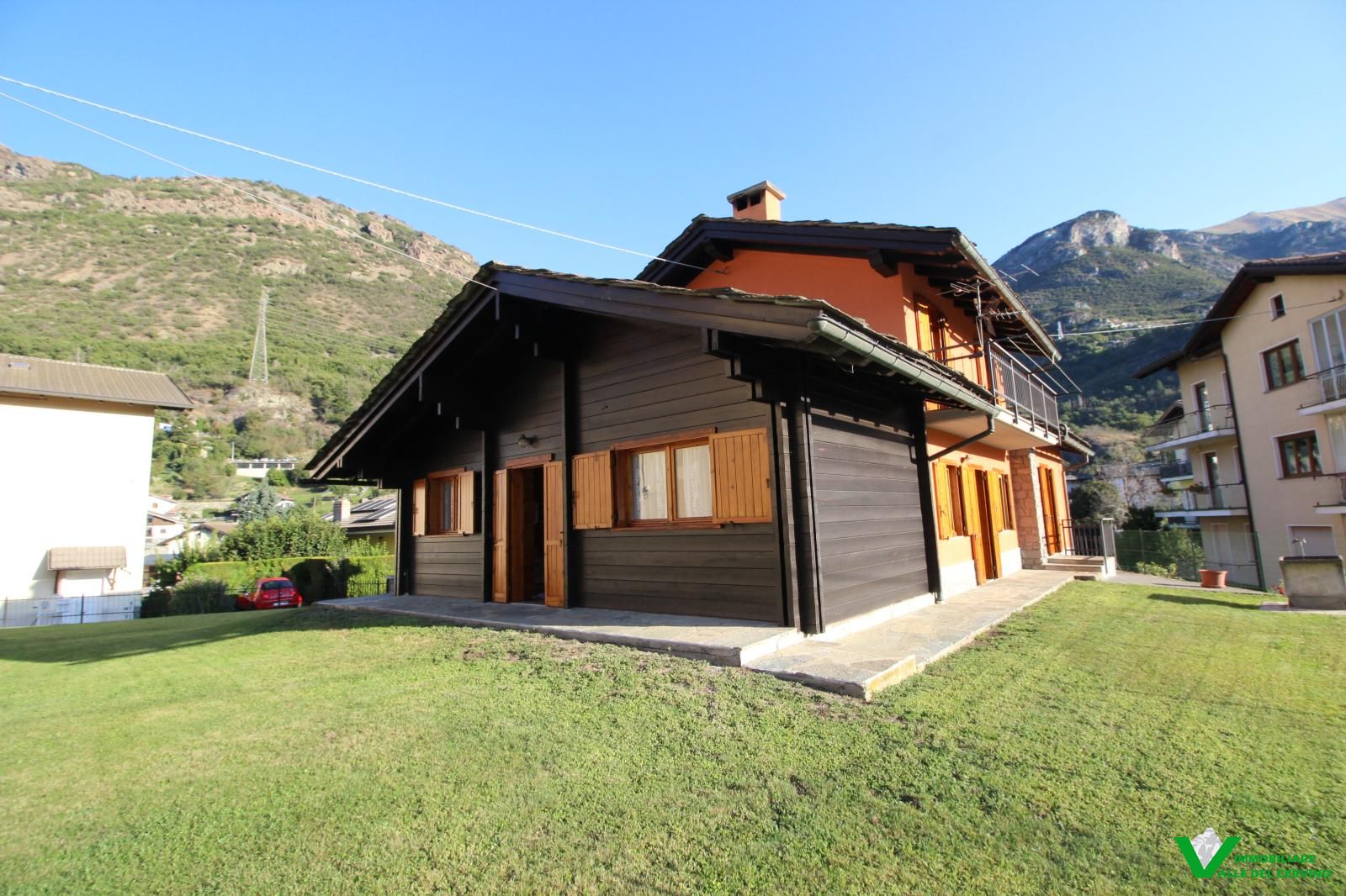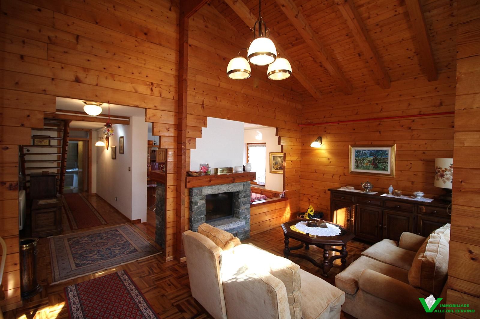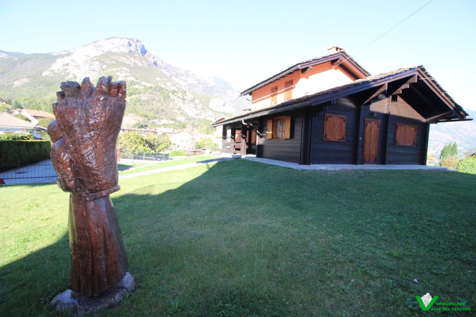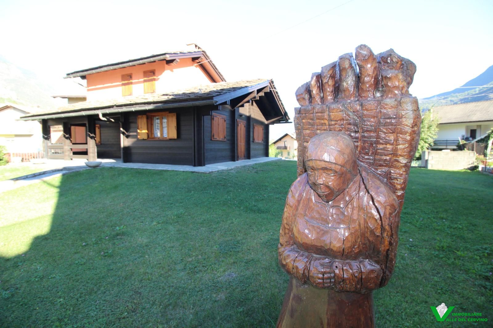 In località Grange de Barme, tranquilla e a poca distanza dai principali servizi, suggestiva villa indipendente circondata da 500 mq di curata area verde nella quale risalta tradizinnale scultura in legno. Entrando da gradevole porticato si può apprezzare la riuscita distribuzione degli spazi con separazione degli ambienti angolo cottura, zona pranzo, soggiorno e salotto in unico open space nel quale risalta caminetto bifacciale; camera e bagno finestrato a completare il piano terra: da tutti gli ambienti accesso diretto all'area esterna. Al piano primo e ultimo 2 camere entrambe con accesso a balcone con gradevole vista sulla valle e bagno. Esternamente posto auto e box auto, cantina e locale caldaia.