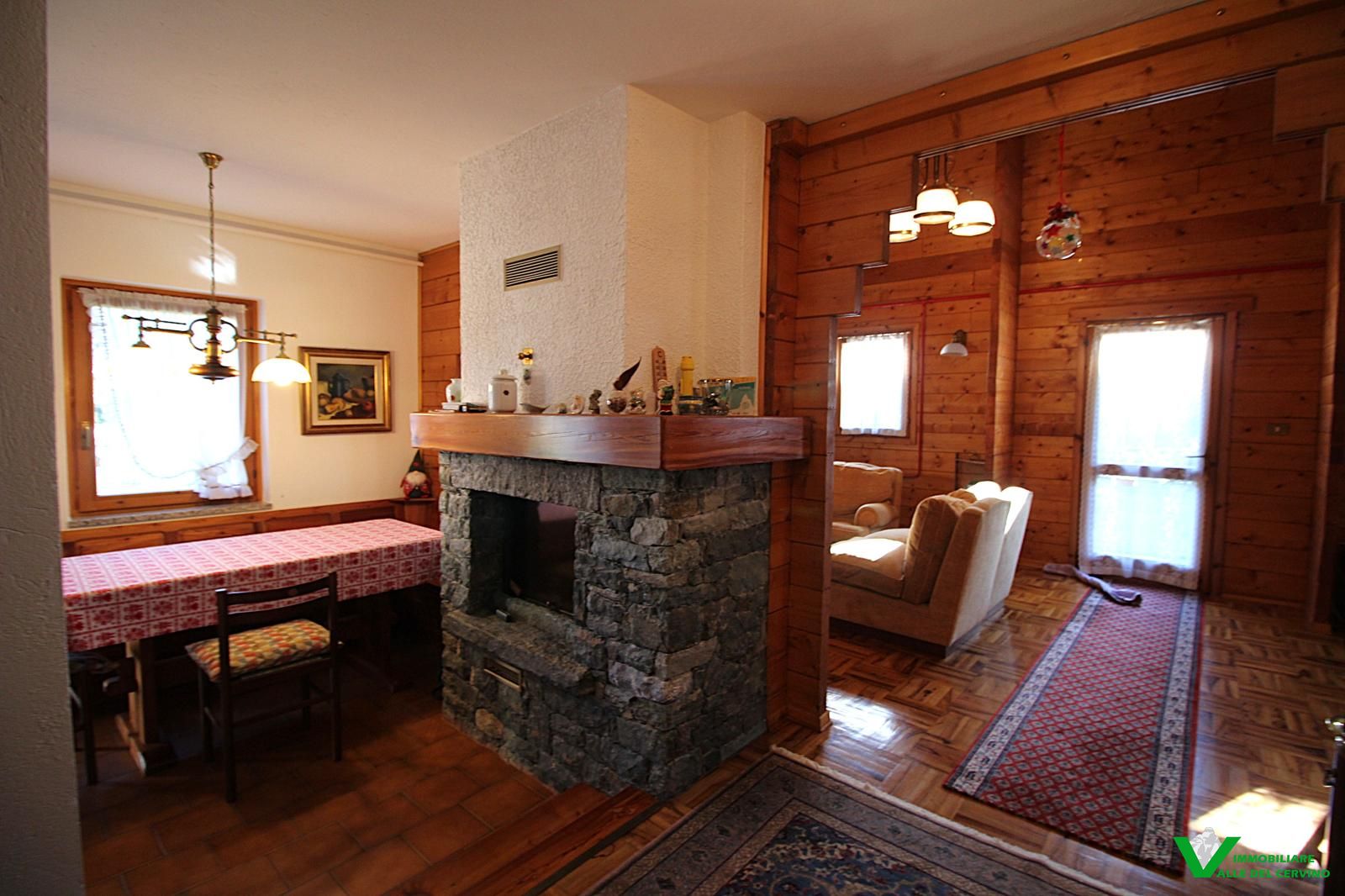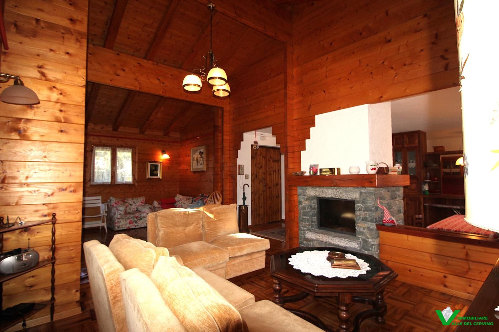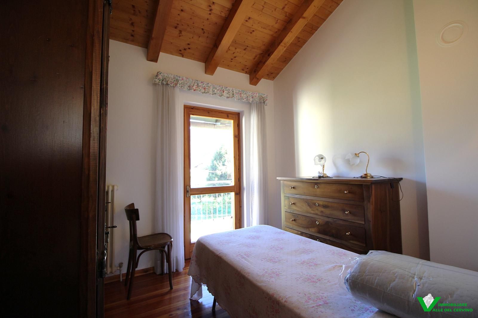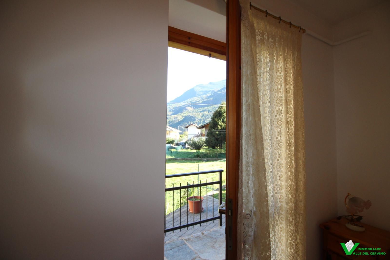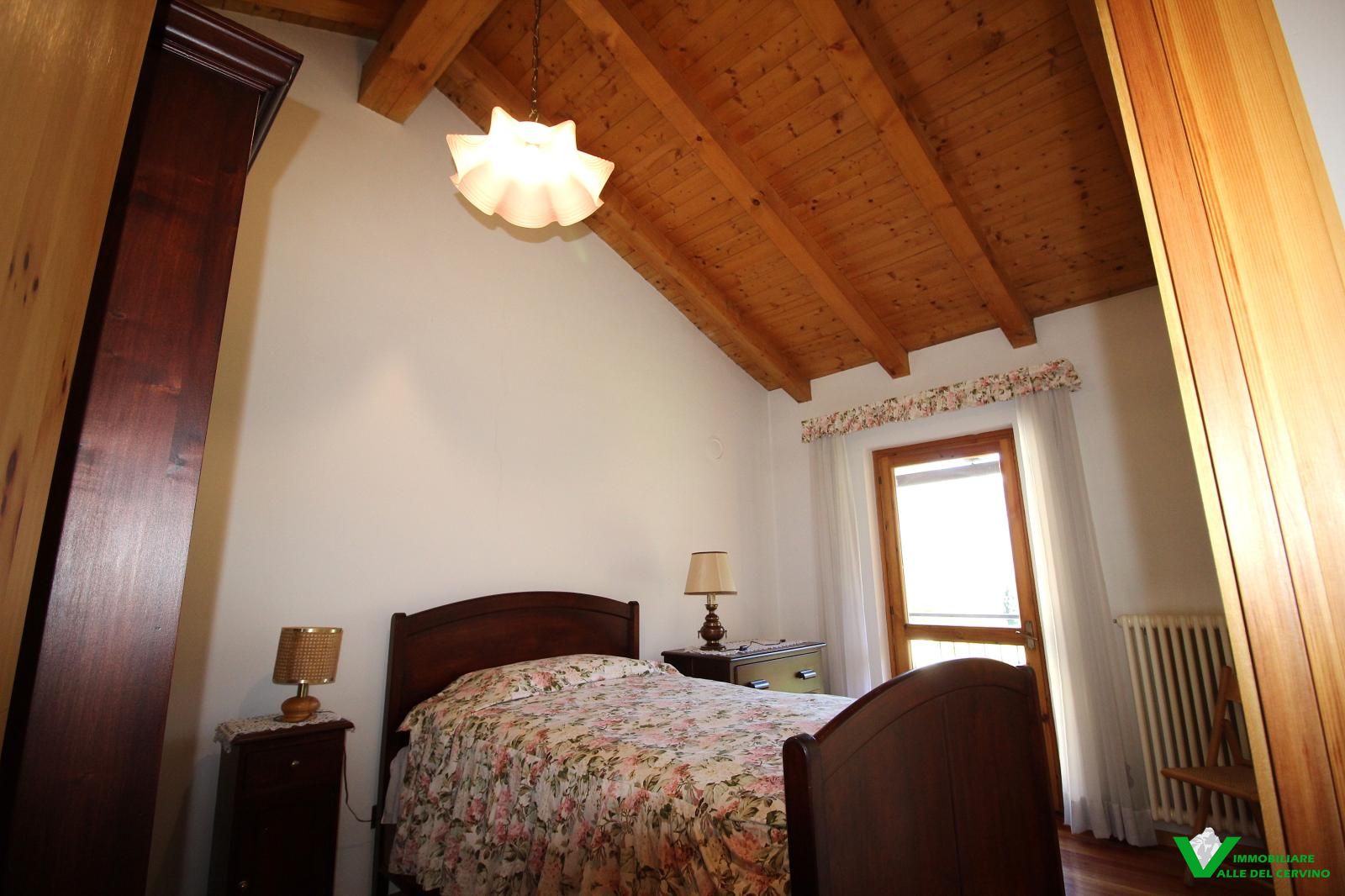 In località Grange de Barme, tranquilla e a poca distanza dai principali servizi, suggestiva villa indipendente circondata da 500 mq di curata area verde nella quale risalta tradizinnale scultura in legno. Entrando da gradevole porticato si può apprezzare la riuscita distribuzione degli spazi con separazione degli ambienti angolo cottura, zona pranzo, soggiorno e salotto in unico open space nel quale risalta caminetto bifacciale; camera e bagno finestrato a completare il piano terra: da tutti gli ambienti accesso diretto all'area esterna. Al piano primo e ultimo 2 camere entrambe con accesso a balcone con gradevole vista sulla valle e bagno. Esternamente posto auto e box auto, cantina e locale caldaia.