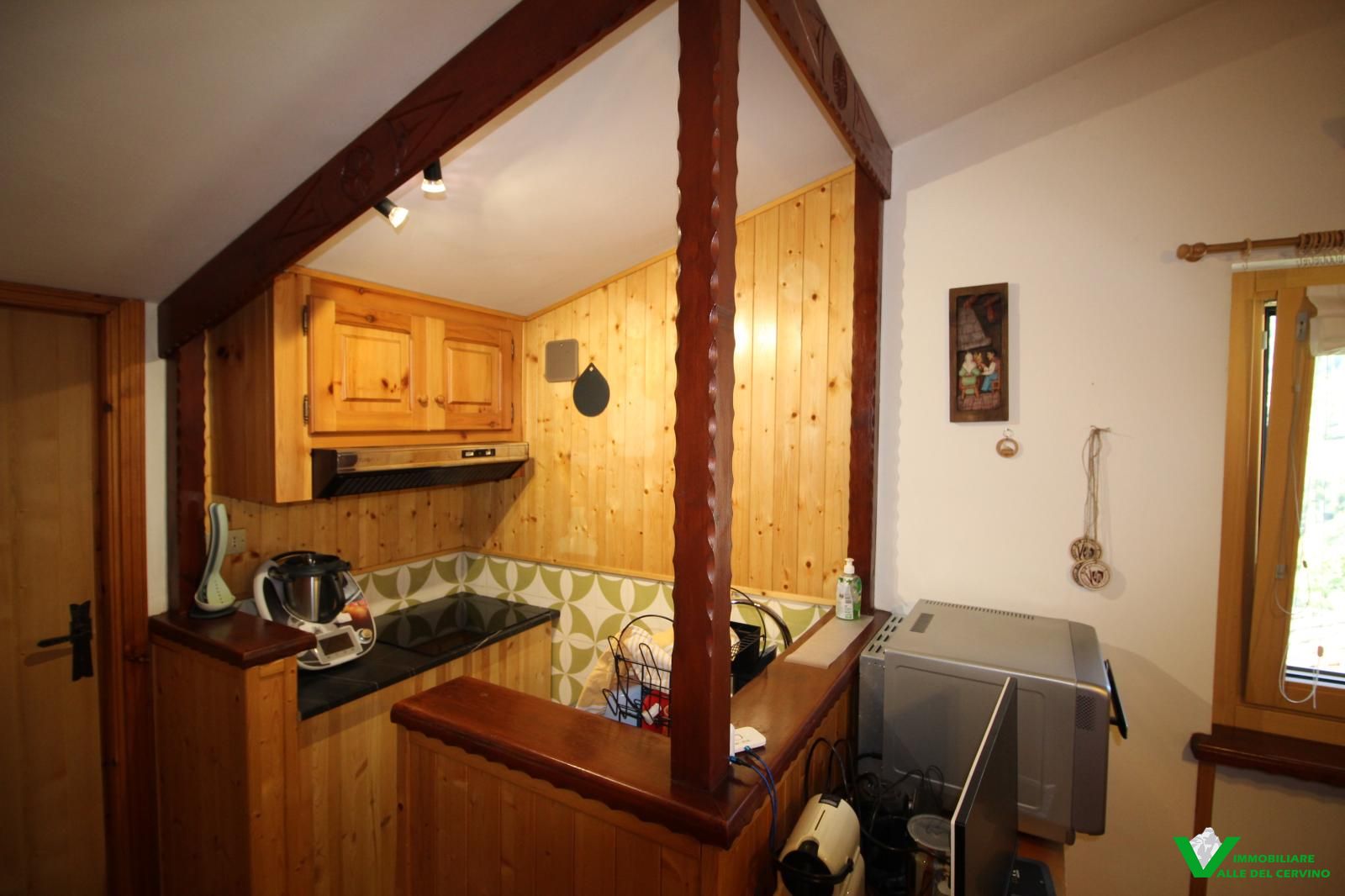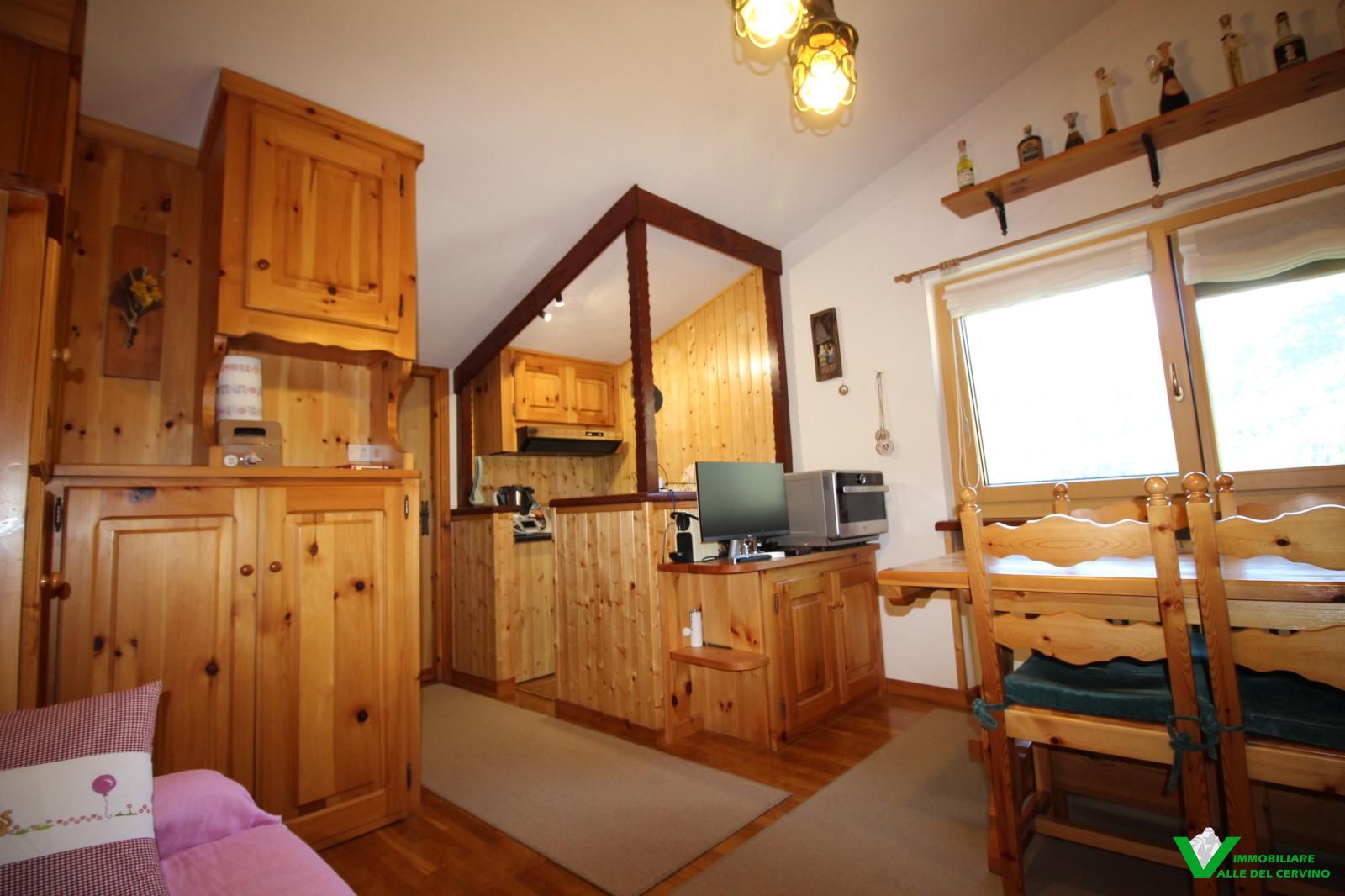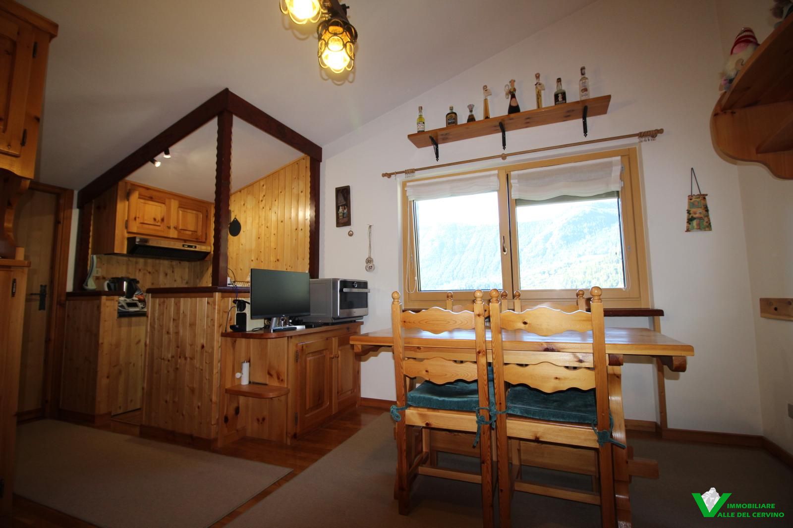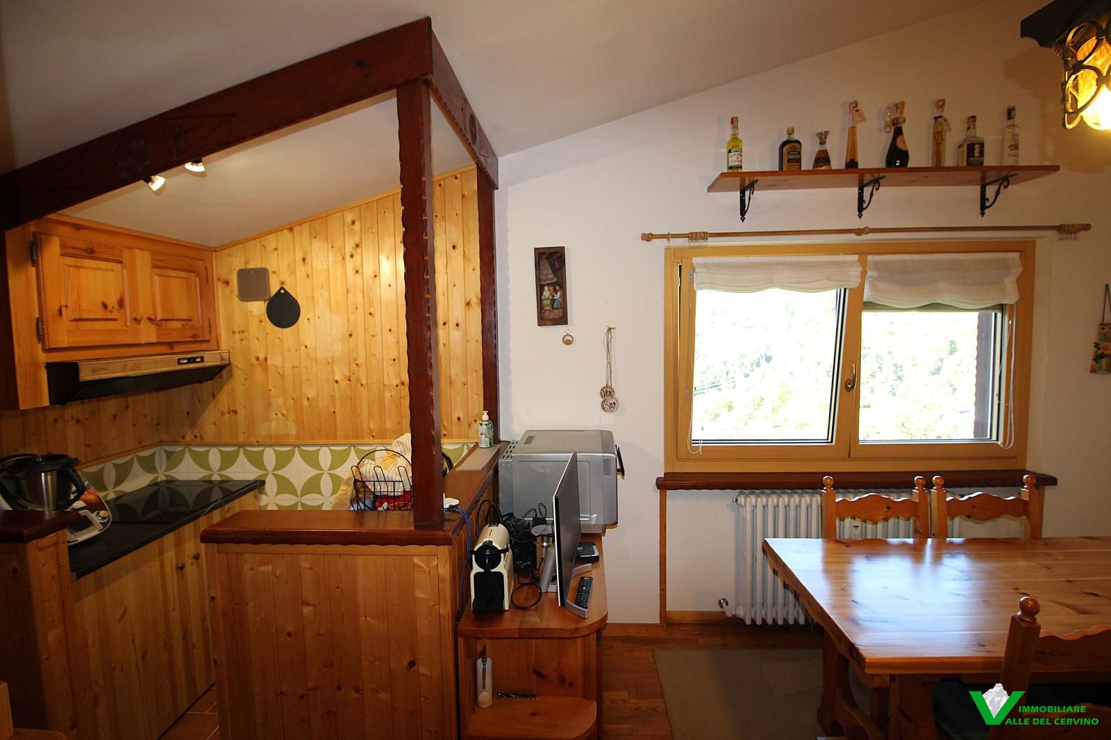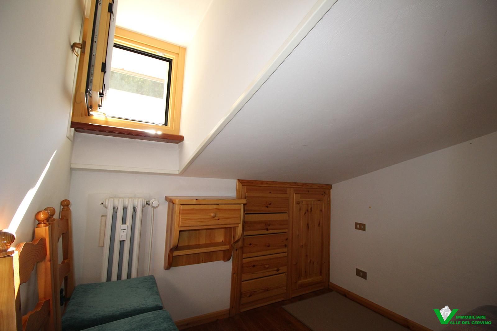 Petit Antey. Al terzo e ultimo piano senza ascensore di condominio ubicato in ottima posizione: soleggiata, tranquilla e a poca distanza dai servizi, curata mansarda in eccellente stato manutentivo con serramenti triplo vetro, porta blindata e intero arredamento in legno su misura a ottimizzarne lo spazio. Luminoso soggiorno con ampia vetrata e bella vista sulla valle, cucinotto, camera da letto, bagno.