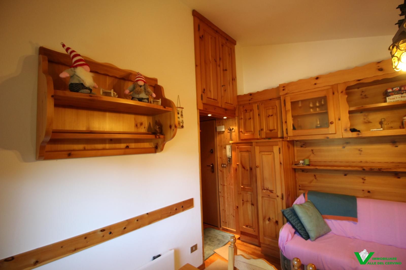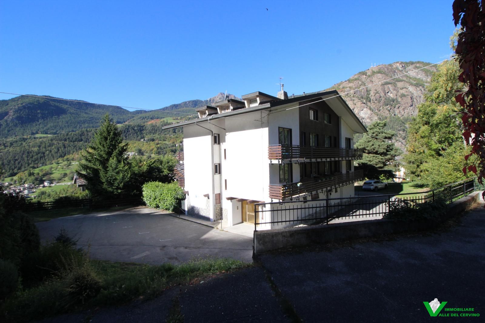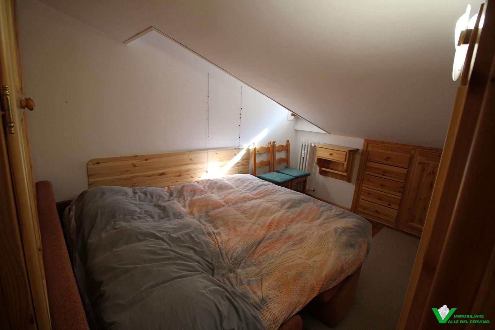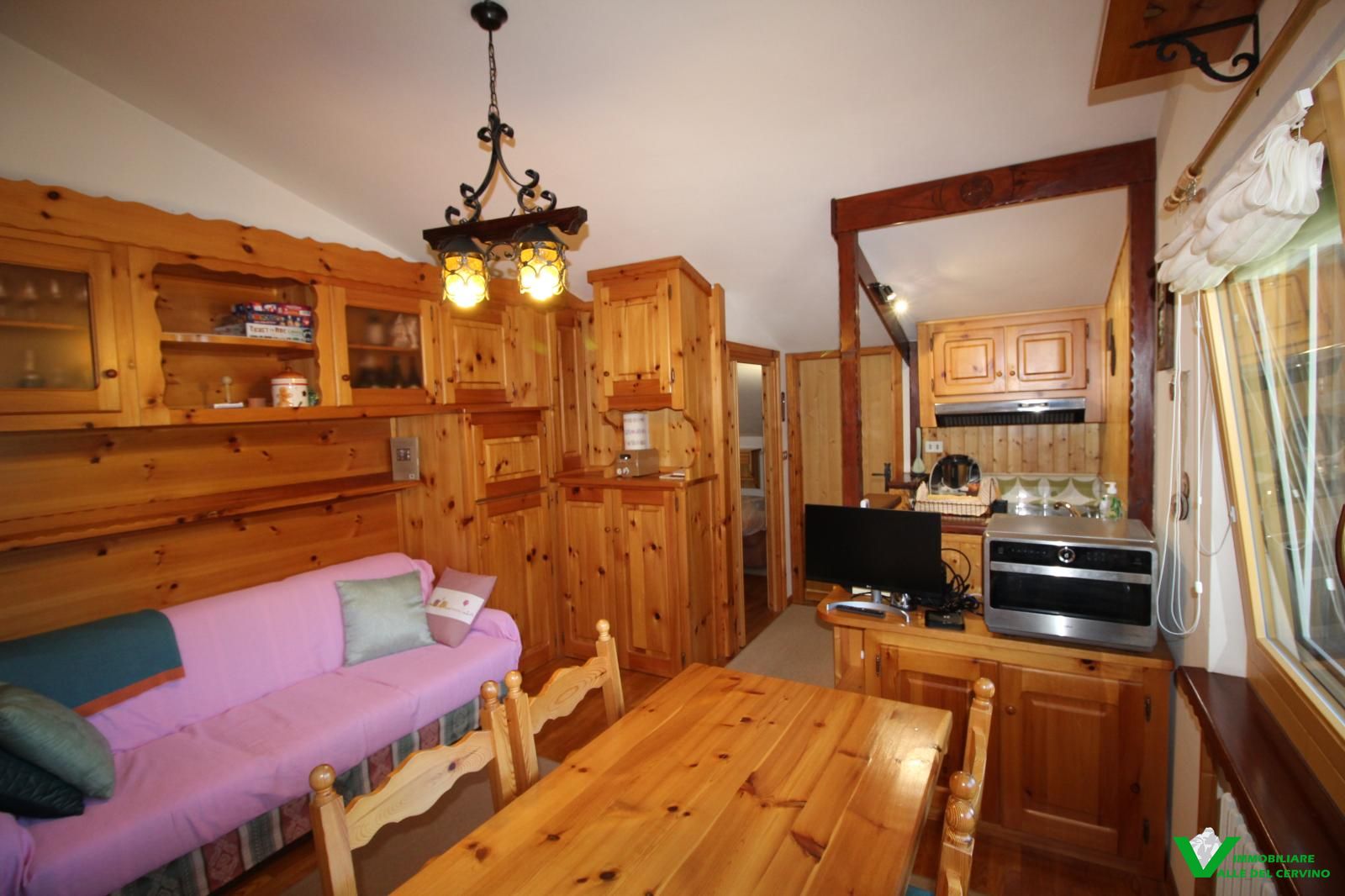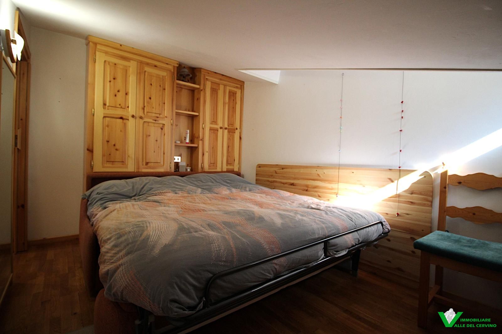 Petit Antey. Al terzo e ultimo piano senza ascensore di condominio ubicato in ottima posizione: soleggiata, tranquilla e a poca distanza dai servizi, curata mansarda in eccellente stato manutentivo con serramenti triplo vetro, porta blindata e intero arredamento in legno su misura a ottimizzarne lo spazio. Luminoso soggiorno con ampia vetrata e bella vista sulla valle, cucinotto, camera da letto, bagno.